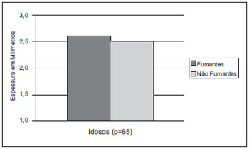 Quanto à dimensão da espessura das pregas vocais de idosos fumantes e não fumantes, no Gráfico 3 visualizamos que não houve diferença significativa entre os grupos. No entanto, estudos (8) mostram que existe um aumento na espessura do epitélio das cordas vocais de fumantes e etilistas, quando comparado com o mesmo tecido de não fumantes e não etilistas. Portanto, a associação fumo-álcool pode potencializar as mudanças morfológicas, mas as diferenças encontradas devem estar limitadas ao nível microscópico.