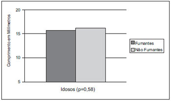 RESULTADOSNo Gráfico 1, observamos a comparação da média do comprimento das pregas vocais dos idosos fumantes que foi 15,61mm e não fumantes de 16,16mm. Pelo cálculo estatístico através do teste t Student (p<0,05) o índice de significância foi de p=0,58 não havendo diferença estatística significante entre os dois grupos. Logo, o comprimento não foi alterado pelo efeito do fumo.