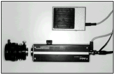 Figura 2. Câmera de quimografia, adaptador de telescópio e pedal.