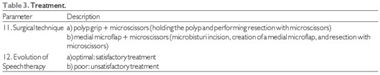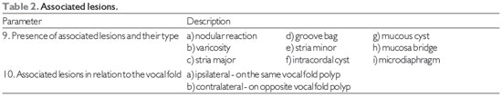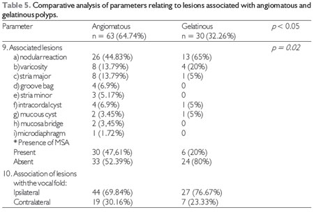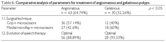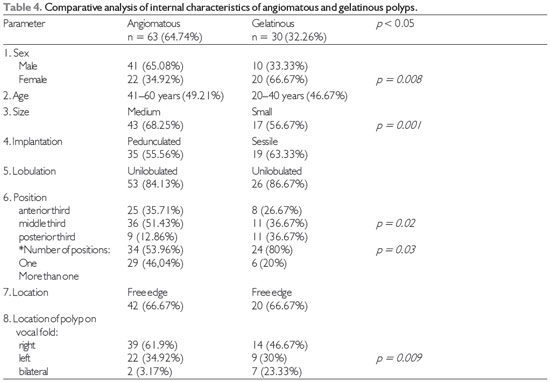 RESULTSAll 93 patients underwent laryngeal surgery due to a diagnosis of polyps of the vocal folds during the period February 2010 to February 2011. Of these, 63 (64.74%) had angiomatous and 30 (32.26%) had gelatinous polyps. Regarding sex, 51 were male and 42 female. Their age ranged from 20 to 80 years. The distribution according to the 12 parameters for each type of polyp is shown in Tables 4, 5, and 6.