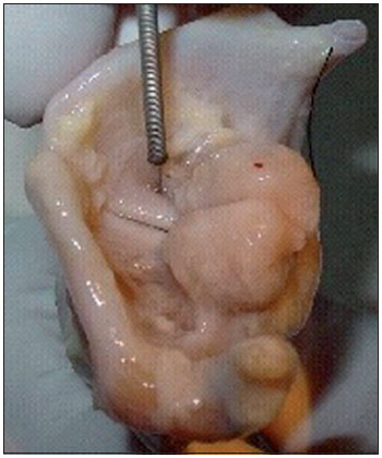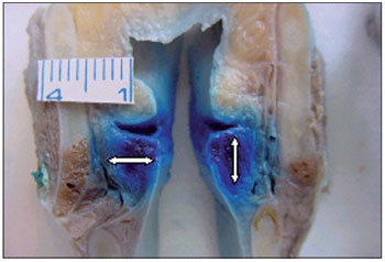 This was an experimental study of 18 larynges that were excised from human cadavers. The larynges were obtained from the University of São Paulo School of Medicine, São Paulo Municipal Department of Death Certification, located in the city of São Paulo, Brazil. All larynges were removed within the first 24 h after death. We used 14 male larynges and 4 female larynges. All larynges were obtained from adult individuals of 30-87 years of age (mean age, 55.5 years). The cause of death was not taken into consideration, given that all larynges were macroscopically intact.