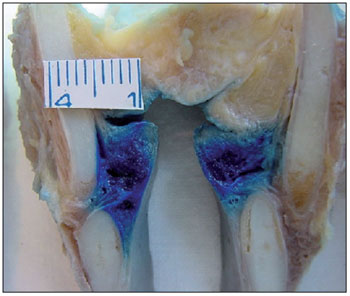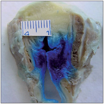 In the present study, we used aniline blue, a water-soluble stain that targets muscle fibers, at a concentration of 2%. The methodology employed was similar to that used for the injection of botulinum toxin in the Clinical Otolaryngology Department of the University of São Paulo School of Medicine Hospital das Clínicas (5). We used a flexible needle (model no. IN-2010; Machida Endoscope Co., Ltd., Tokyo, Japan) with a 0.5 mm tip. The needle was introduced into the TA muscle and middle third of the vibratory portion of the vocal fold, approximately 1 mm lateral to junction of the vibratory portion and the floor of the laryngeal vestibule (Figure 1). We injected 0.2 mL of aniline blue into the right and left vocal folds of each larynx. This volume (0.2 mL) is the volume that is used for botulinum toxin injections at our facility. The larynges remained in an anatomical position for 30 min, after which they were immersed in 10% buffered formalin and left for 7 days. The larynges were then placed in 7% nitric acid for 24 h for decalcification, being subsequently immersed in the same buffered formalin solution. The larynges were removed from the buffered formalin solution and stored at -10oC. In order to standardize the laryngeal sections, we drew a line (corresponding to the projection of the right vocal fold) on the ipsilateral thyroid cartilage lamina, parallel to the lower border of the cartilage. After measuring the width of the lamina along this line, we divided the line into 4 equal parts. The larynges were coronally sectioned with a microtome blade at 3 points (at the demarcated levels), resulting in 4 sections (designated sections I, II, III, and IV, from posterior to anterior). All sections were examined under a surgical microscope in order to identify the regions and muscles that showed aniline blue staining. For subsequent analyses, the sections were photographed with a digital camera (DSC-S30; Sony Corporation, Tokyo, Japan) at a resolution of 640 X 480 pixels.