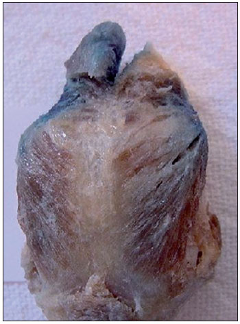 Aniline blue diffusion to the CT muscle was observed in 42.86% of the cases (Figure 4). It is known that CT muscle involvement can lead to decreased fundamental frequency of phonation and, when accompanied by LCA and TA muscle paralysis, can decrease vocal intensity. The PCA muscle is the only abductor muscle of the larynx. In the present study, aniline blue diffusion to the PCA muscle was observed in 8.57% of the cases studied (Figure 5).