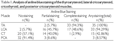 We examined the TA, LCA, cricothyroid (CT), and posterior cricoarytenoid (PCA) muscles for aniline blue staining. We examined both sides of the sections because of the possibility of finding different degrees of aniline blue staining at different depths. Stained muscles were defined as those in which the entire length of the muscle (in at least one of the sections) showed aniline blue staining. Partially stained muscles were defined as those in which part of the muscle, however small, did not show staining. In order to analyze the PCA muscle, we dissected the posterior lamina of the cricoid cartilage.