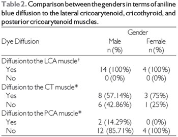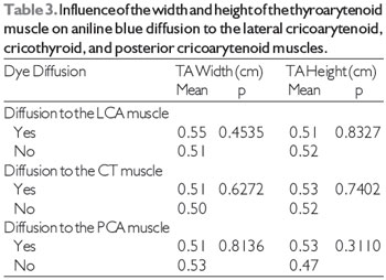 Table 2 shows the results of the comparison between the genders in terms of the frequency of dye diffusion. Since there was dye diffusion to the LCA muscle in all larynges, it was impossible to perform a statistical analysis of this variable for the LCA muscle. We found that neither the width nor the height of the TA muscle had a significant influence on aniline blue diffusion to the LCA, CT, and PCA muscles (Table 3).
