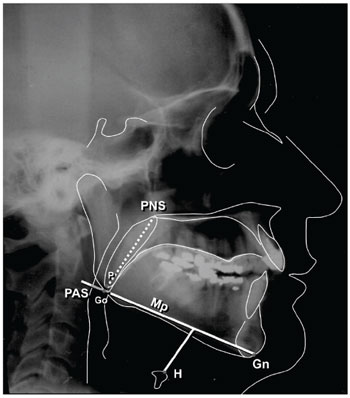 A study by Bharadwaj, Ravikumar, and Krishnaswamy conducted in India compared 10 OSAHS patients to a control group of 10 healthy subjects (mean age, 34.9 years). These authors concluded that upright cephalometry demonstrated mandibular retrognathism, increased ANB angle, increased PNS-P length and increased soft palate thickness, increased tongue length, and decreased PAS in the group of OSAHS patients when compared to the control group (11). Other studies have shown that PNS-P and MP-H measurements are increased, while PAS is decreased, in patients with OSAHS, and these measurements were considered predictive of OSAHS (7,9,15). PAS measurement was correlated with severity of OSAHS assessed using the AHI (7,9). A study conducted in Strasbourg (France) in 1990, comparing 43 OSAHS patients to a control group of 40 asymptomatic individuals, showed that PNS-P measurement was increased in patients with OSAHS, while SNA, SNB, and ANB measurements did not demonstrate any alterations in either group (28). Other studies have shown increased MP-H measurement and decreased PAS measurement in comparisons between OSAHS groups and control groups (13,40). However, Mayer et al (42) found no correlation between PAS measurement and AHI.