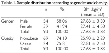 Of the 93 patients studied, 54 (58.1%) were male. The mean BMI was 27.68 ± 3.83 kg/m2 (women, 27.41 ± 4.50 kg/m2; men, 27.88 ± 3.30 kg/m2). There were 69 (74.19%) nonobese (BMI, 25.90 ± 2.29 kg/m2) and 24 (25.81%) obese (BMI, 32.81 ± 2.50 kg/m2) patients (Table 1).