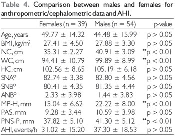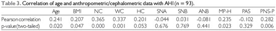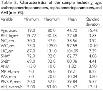 Data was entered into the Statistical Package for the Social Sciences (SPSS) version 16.0 program for calculation of simple descriptive statistics, e.g., percentage distribution, mean, and standard deviation. A normality test (Kolmogorov-Smirnov) was applied and the adequate statistical test was chosen for each type of variable (parametric or nonparametric). Pearson's correlation coefficients were examined between AHI and the following variables: age, BMI, NC, WC, HC, and cephalometric measurements (SNA, SNB, ANB, MP-H, PAS, and PNS-P). Sex differences were compared by the Student's t test. Statistical significance was set at p < 0.05.