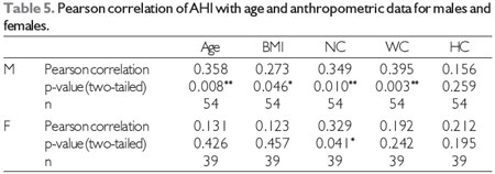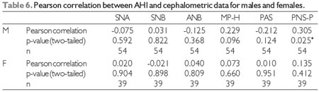 Tables 5 and 6 show an analysis of the Pearson correlation coefficients used to assess the relationship between AHI and age as well as anthropometric/cephalometric measurements for males and females.