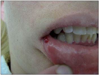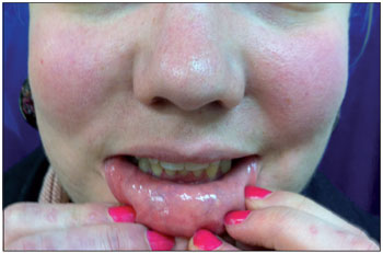 As initial treatment, we administered 100 mg dapsone, 250 mg chloroquine, 50 mg azathioprine, and 50 mg prednisone. Although this resulted in improvement of the lesions, there was persistence of some scarring plaques on the trunk and lower lip. The patient was followed up for 6 months. During this period, she remained clinically stable, without active lesions in the oral mucosa and lips (Fig. 4), and we gradually reduced her dose of prednisone.